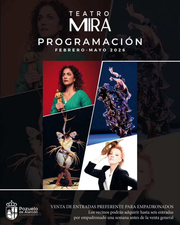 El Ayuntamiento de Pozuelo de Alarcón presenta una variada programación cultural en el Teatro MIRA, con danza, teatro, música y actividades familiares entre febrero y mayo. La venta de entradas comienza el 9 de enero, priorizando a los empadronados. Se incluyen celebraciones especiales y propuestas educativas para docentes.