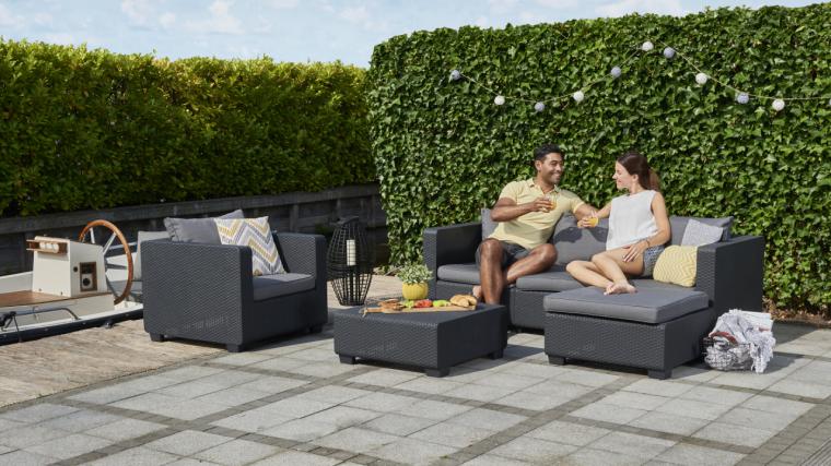 Su textura de imitación ratán es ideal para tu jardín, patio o terraza, pero con todas las ventajas de la resina: resiste a las condiciones atmosféricas más adversas, no se degrada, no se decolora, no se oxida, no se deforma… En resumen: no requiere de ningún mantenimiento para estar siempre perfecta. Podrás disfrutar de su elegante diseño y sus colores neutros (grafito y gris) durante muchos años.